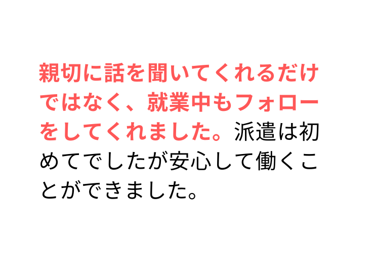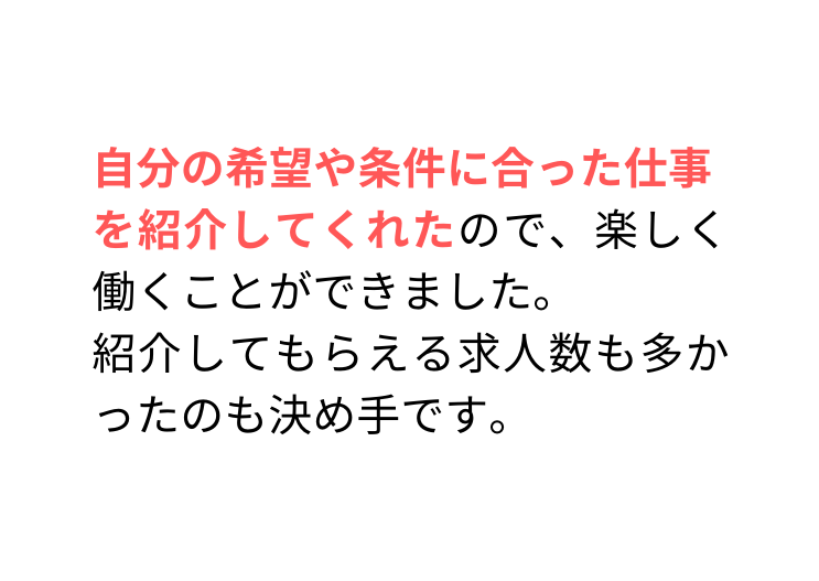自分の希望や条件に合った仕事を紹介してくれたので、楽しく働くことができています。紹介してもらえる求人数も多かったのも決め手です。